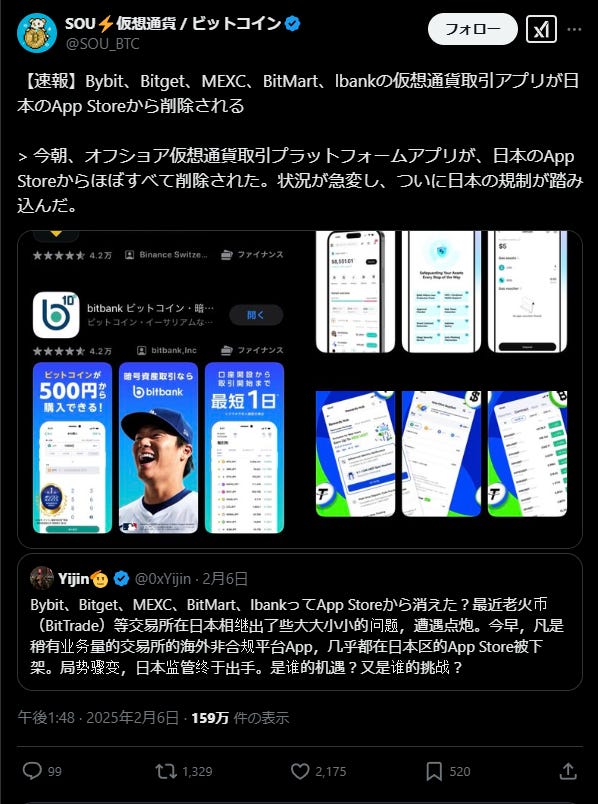 2025年2月6日に暗号資産取引アプリの一部が日本のApp Storeから削除されました。