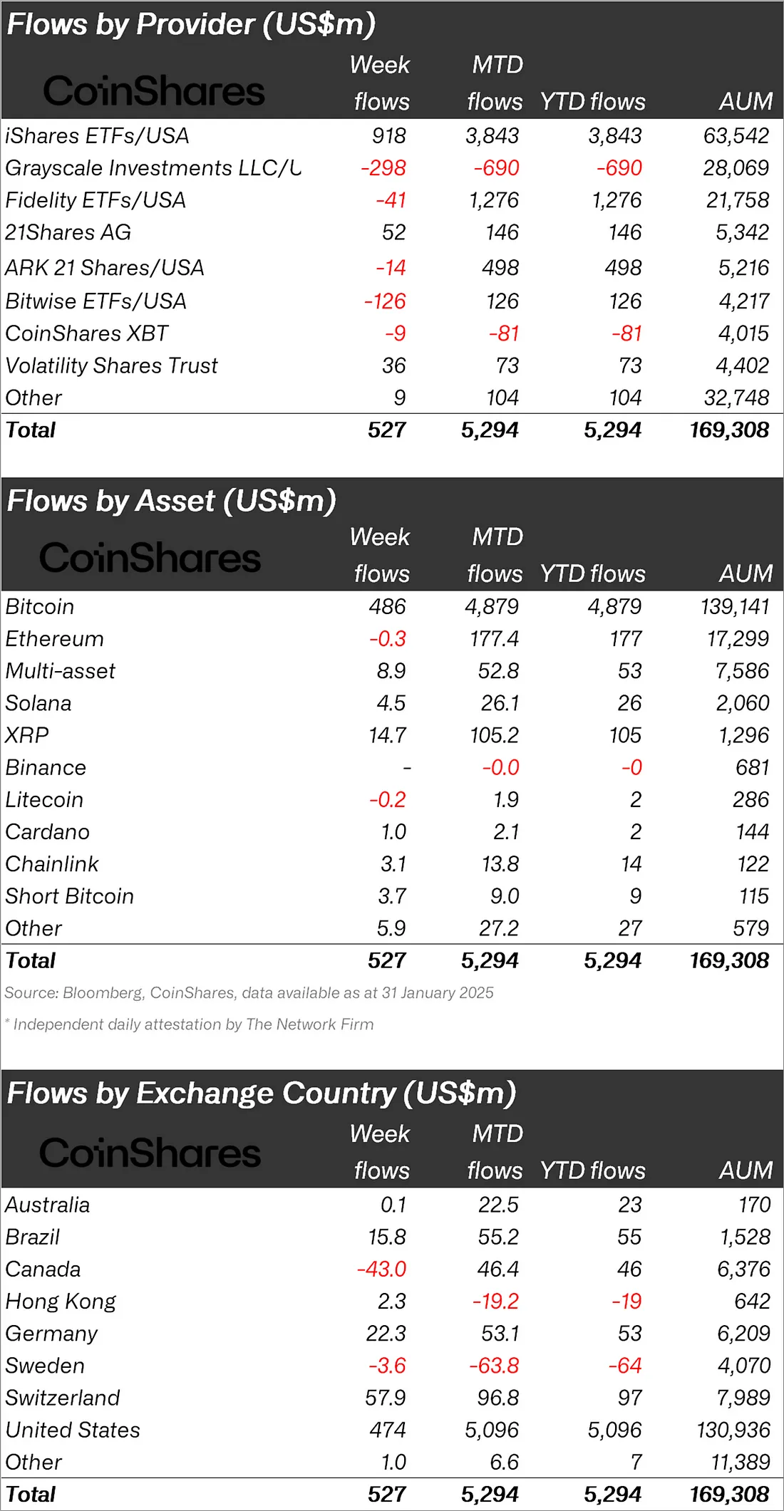 暗号資産ETFへの先週の流入額は、合計5億2,700万ドルに上った。しかし、週内の流入額はDeepSeekのニュースなど、市場全体の懸念に大きく影響され、投資家の感情が不安定だったことを反映している。