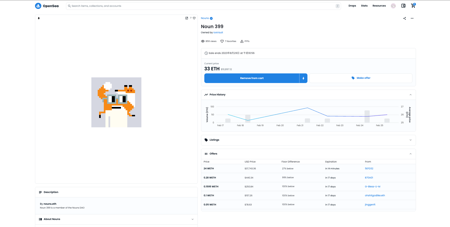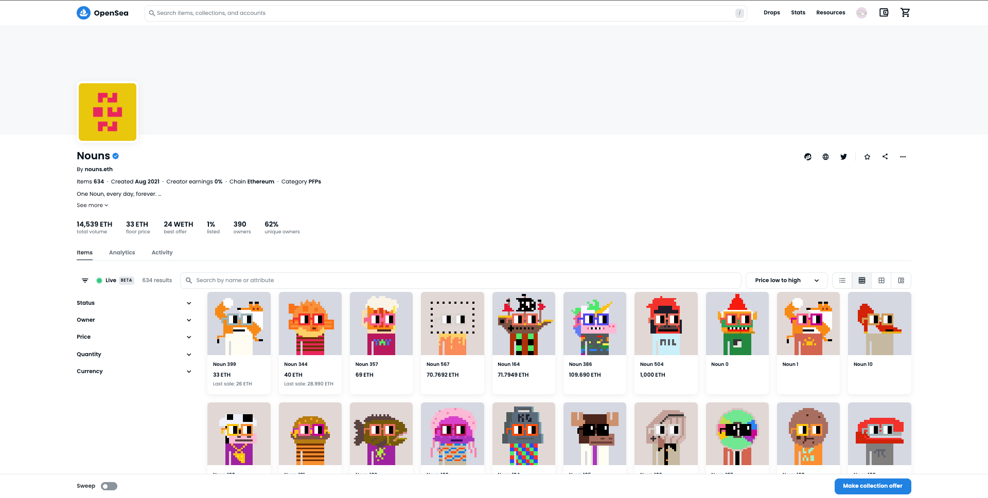 OpenSeaでは、各コレクションのメインのインターフェースは、リスト(*1)されているNFTが先に表示され、オファー(*2)が必要なNFTは、その後ろに並ぶようになっています。