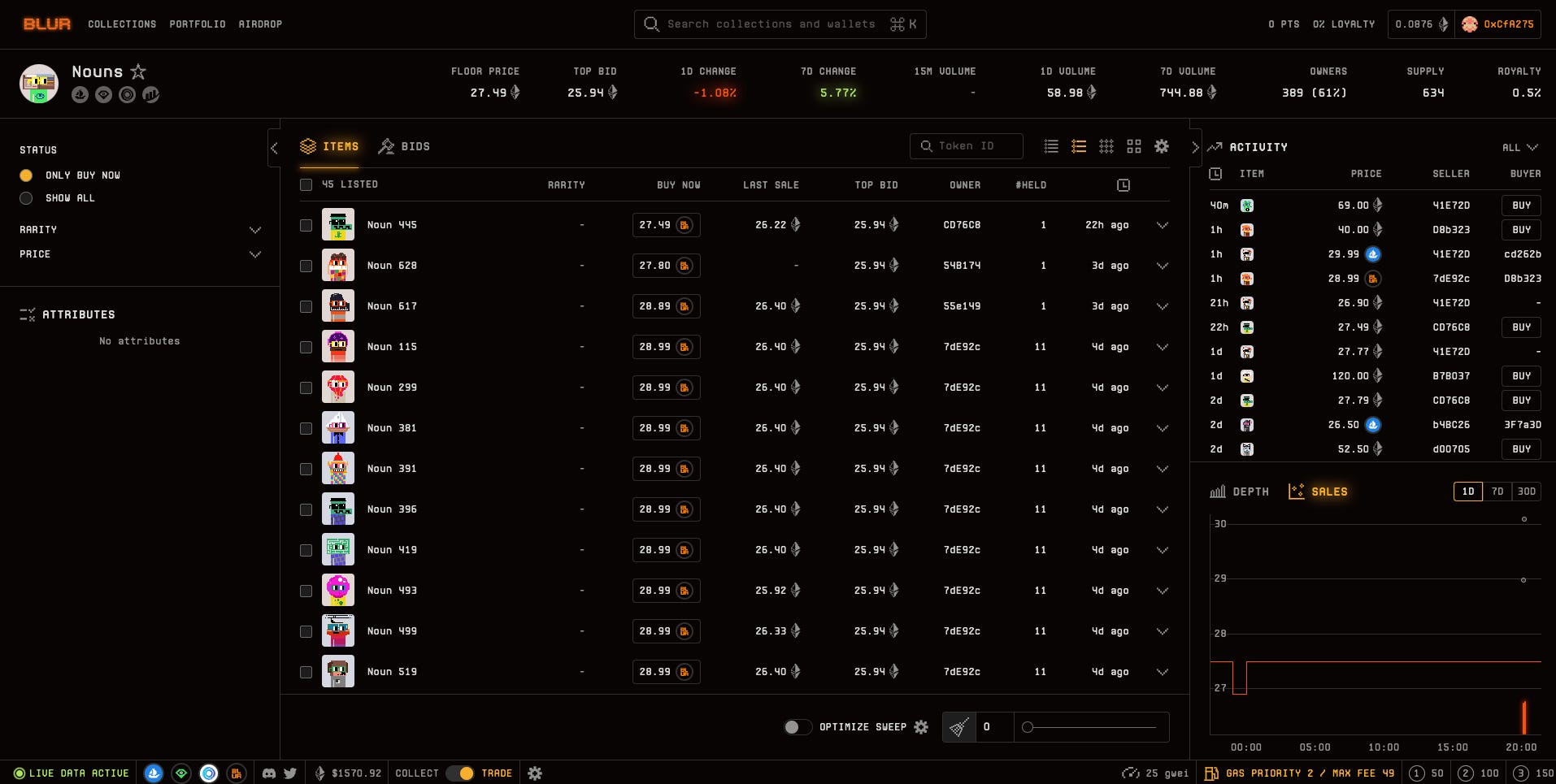 Blurの各コレクションのメインのインターフェースは、先ほどのOpenseaのインターフェースと比較しても情報が多く、一定のユーザーからは使いにくさもあるかもしれません。さらにリストされているNFTしか表示されません。先ほどの「玄人向けの設計」というのは、特にこの辺りが象徴的で、NFTのトレードをするユーザーをターゲットに使われているため、このようなNFTの画像よりも数字が並び、複数のNFTを同時に購入しやすいUIになっています。