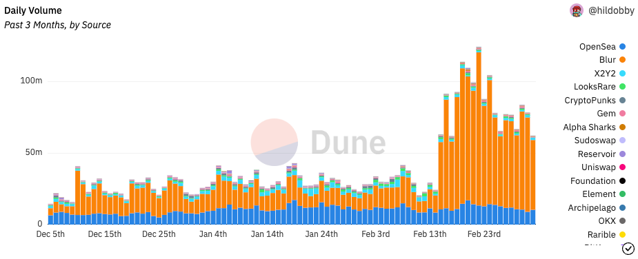OpenSeaと比較して最近登場したプロジェクトですが、登場からこの数ヶ月のトラクションを見るとOpenSeaよりも多くの取引量が発生しています。この数字の裏には、BlurのAirDrop(*3)が一つの要因であり、継続的にこの勢いが続くは、現時点では不明です。