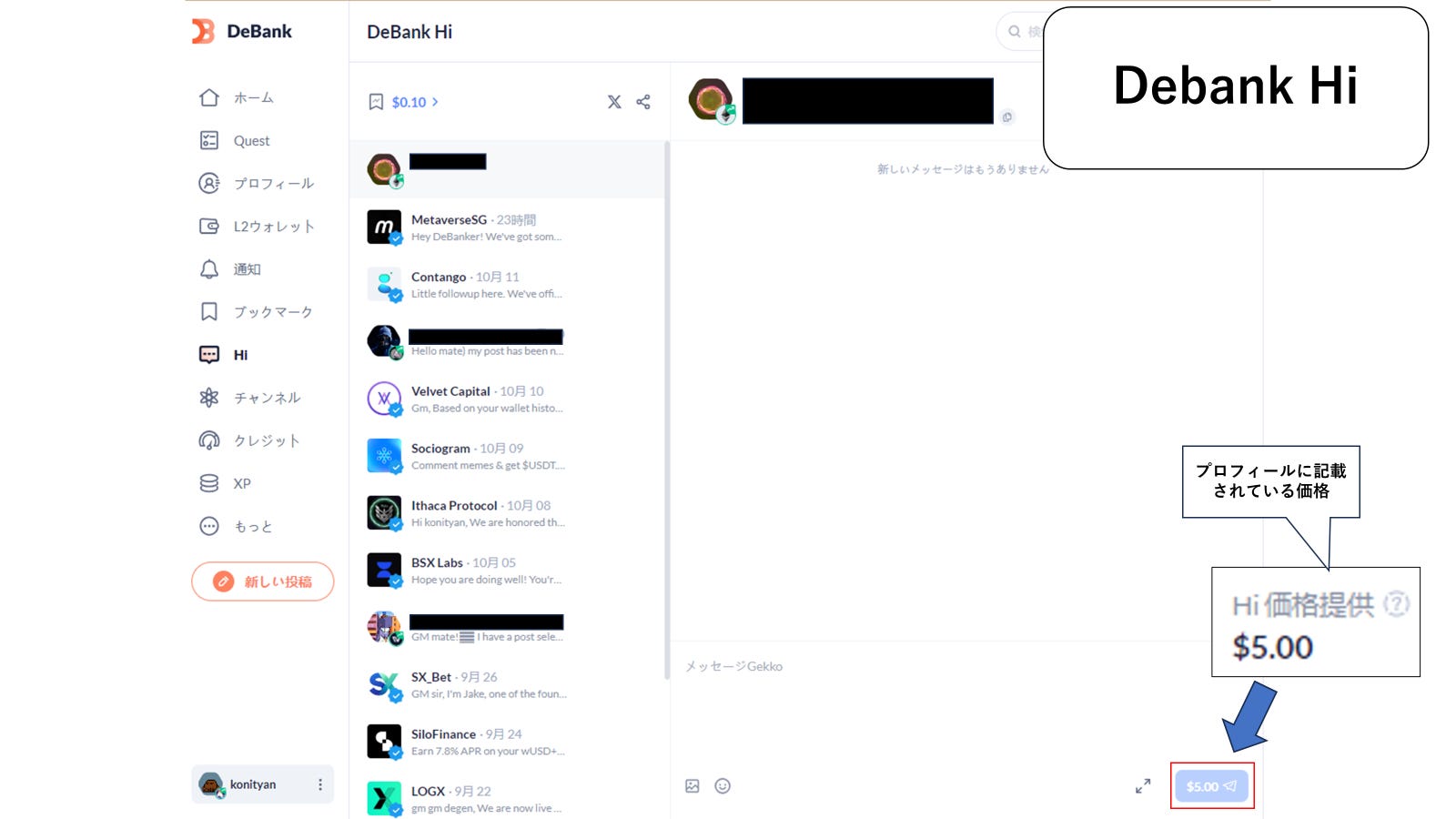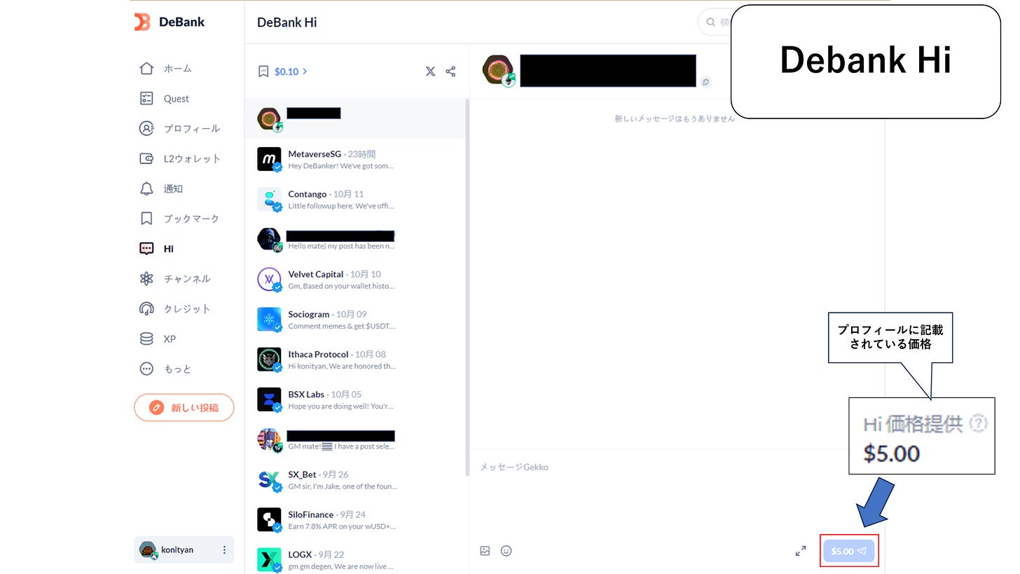 ソーシャル機能には、DeBank ストリームとDeBank Hiがあり、前者はX(旧Twitter)のツイートとタイムライン、後者はDM(ダイレクトメッセージ)のような機能です。