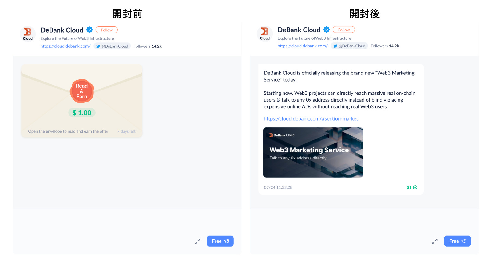 Debankは、ソーシャル機能で紹介したDebank Hiを使ったマーケティングサービスを、Debank Cloudという形で事業者向けに展開しています。このサービスは、Web3プロジェクトを展開している事業者に公式アカウントを割り振り、その公式アカウントからDebank Hiを通じて新しいNFTコレクションのリリースのような重要な内容を、Debankユーザーに直接届けるサービスです。