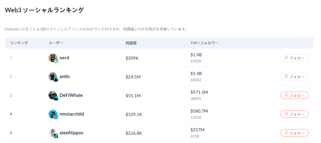 Debankには、ユーザーの資産額とフォローされているユーザーの資産額合計を考慮したWeb3 ソーシャル ランキング、エアドロップの受領やDebankが提供するRabby Walletの使用、ウォレットの使用年数やEthereumメインネットで使ったガス代、有料機能を使用やいいね数によって受け取れるWeb3バッジがあります。