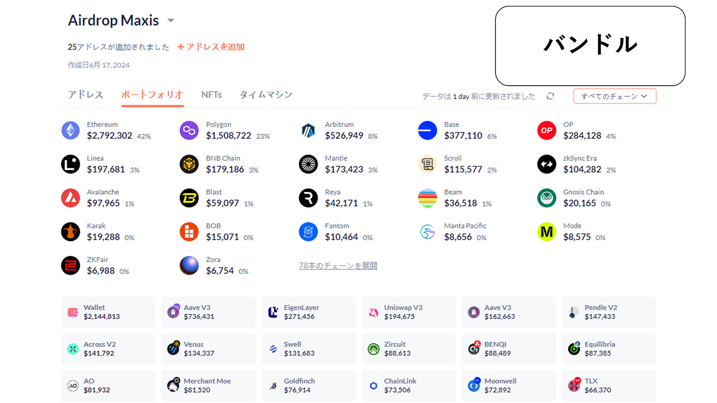 バンドルでは、リスト化したアドレスのポートフォリオや所有しているNFTを一括で確認できます。また、任意の期間を選択して、その間の資産状況の推移を確認できるタイムマシンという有料機能もあります。