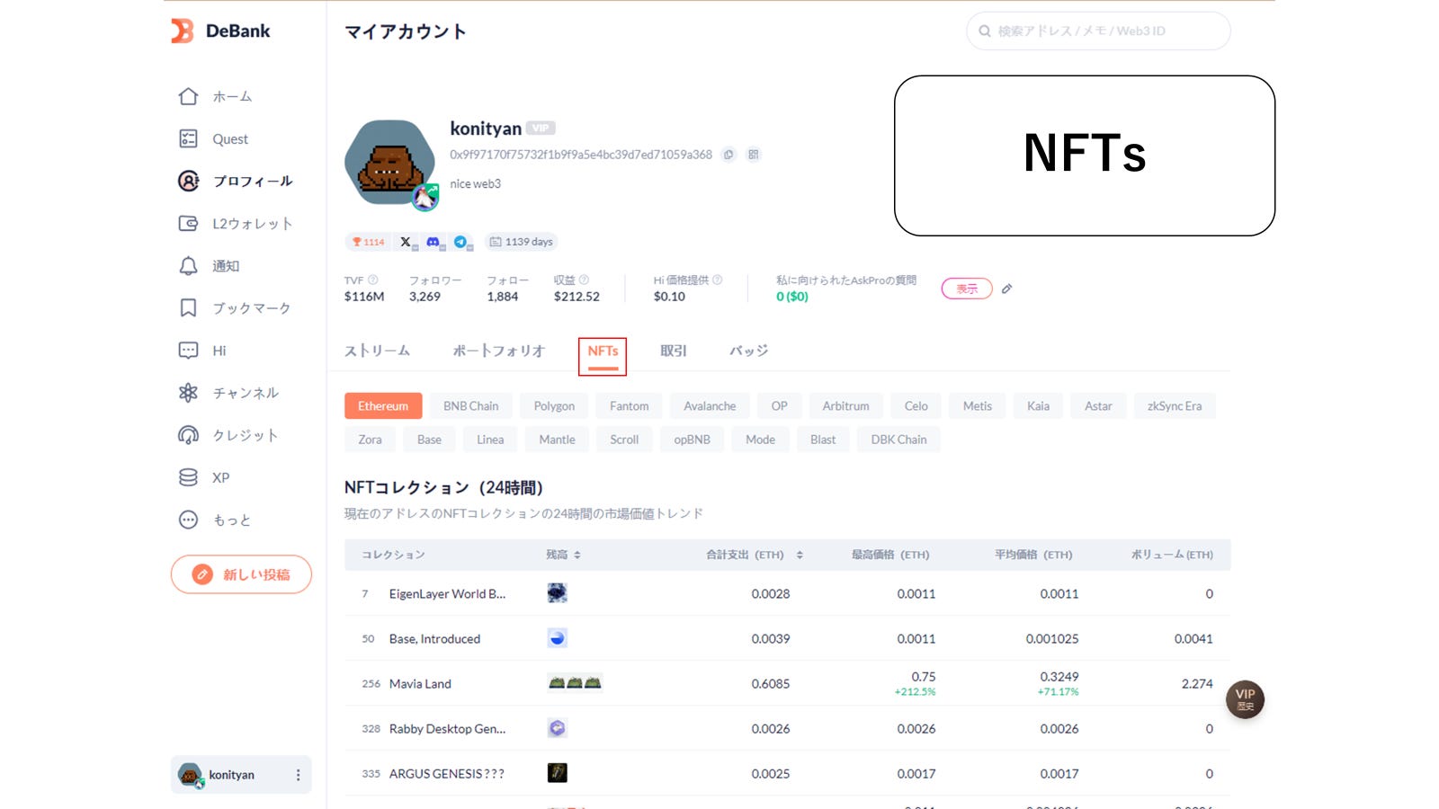 ダッシュボード機能はDebankのサービス開始当初からある機能で、接続した自らのウォレットの資産や、DeFiに預けている資産を確認したり、所有しているNFTの確認や、オンチェーン取引のログを確認ができます。