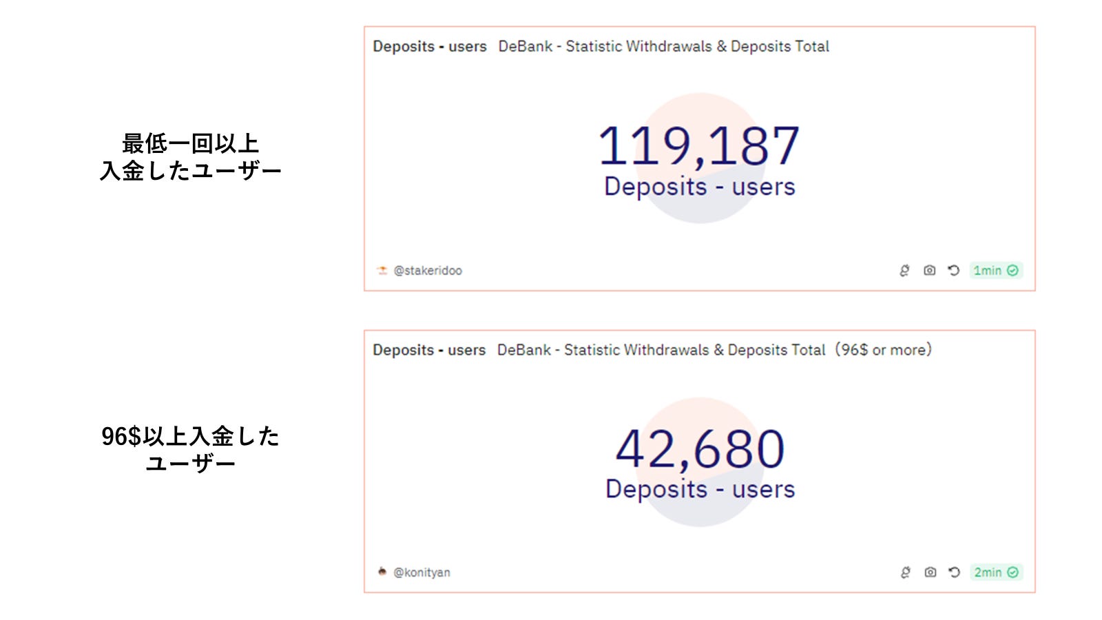 以下の画像は、最低一回以上Debank Layer2に入金したユーザーと、Web3 IDの購入金額である96$以上を入金したユーザー数になります。最低一回以上入金したユーザーは、Web3 IDの上限発行数100,000を超える119,187人ですが、96$以上入金したユーザーは100,000を下回り、10/14時点のWeb 3 ID保有者のWeb3バッジ発行数50,542よりも少ない42,680人です。