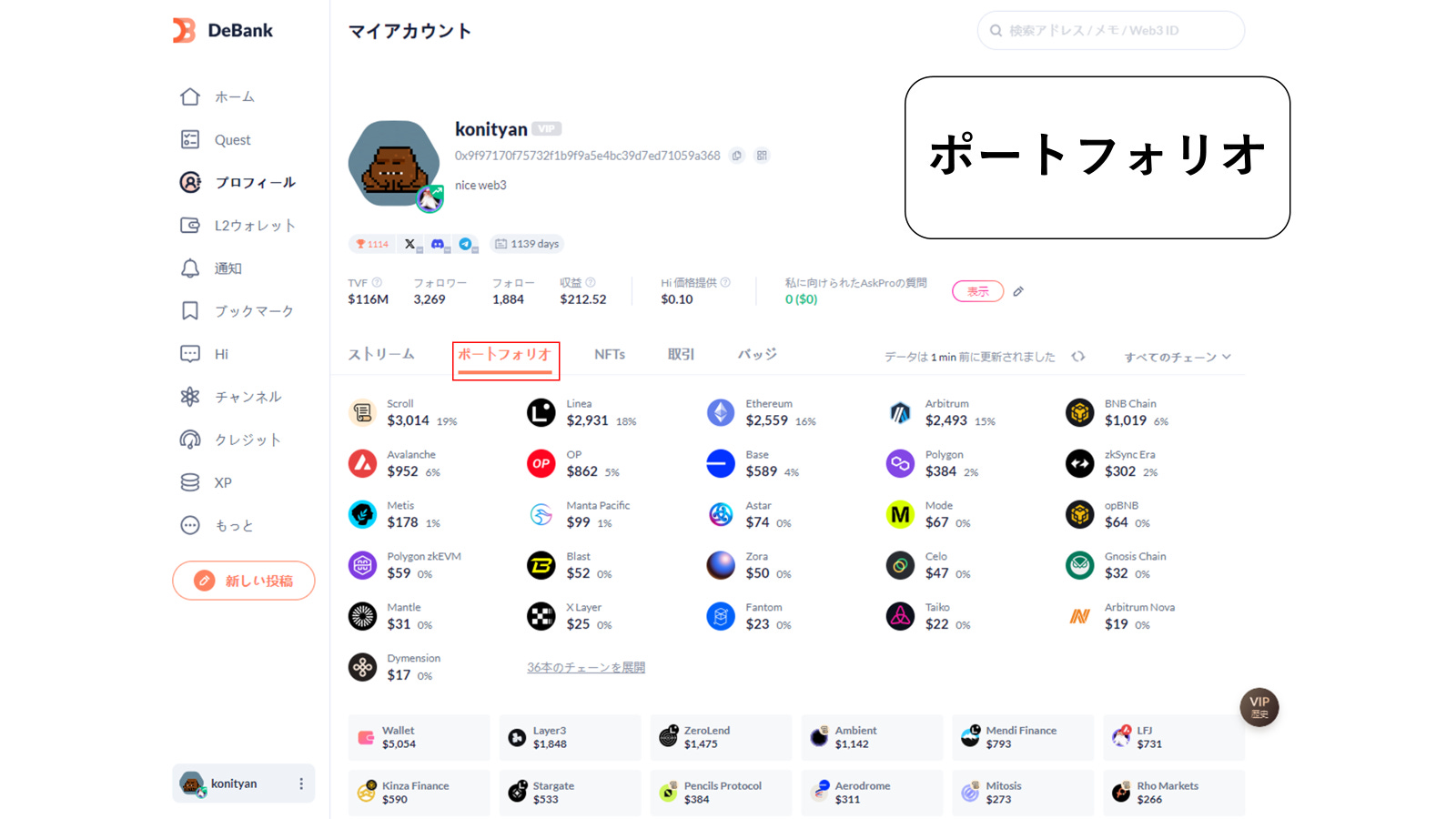 Debankとウォレットを接続した後、プロフィール画面を表示して、以下の赤枠で囲ったポートフォリオタブを選択することで、複数チェーン、DeFi上にある自らの資産を表示・確認ができます。