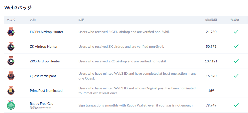 また、ランキングやバッジ以外にも、Web3 IDというユーザーを属性分析できる要素があります。Web3 IDは、96$支払うことで発行できる100,000個限定のDebankのIDになります。このWeb3 IDの保有者が受け取れるバッジによって、DebankのIDを96$払って取得した属性を持つWeb3ユーザーを把握できます。